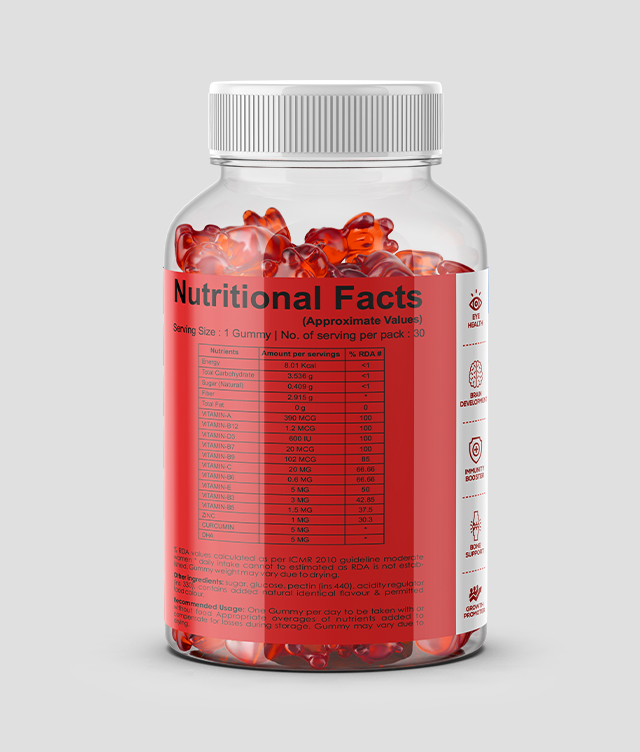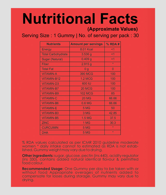 Vitamin A, B3, B5, B6, B7, B9, B12, C, E, D3, Zinc, Curcumin, DHA.
