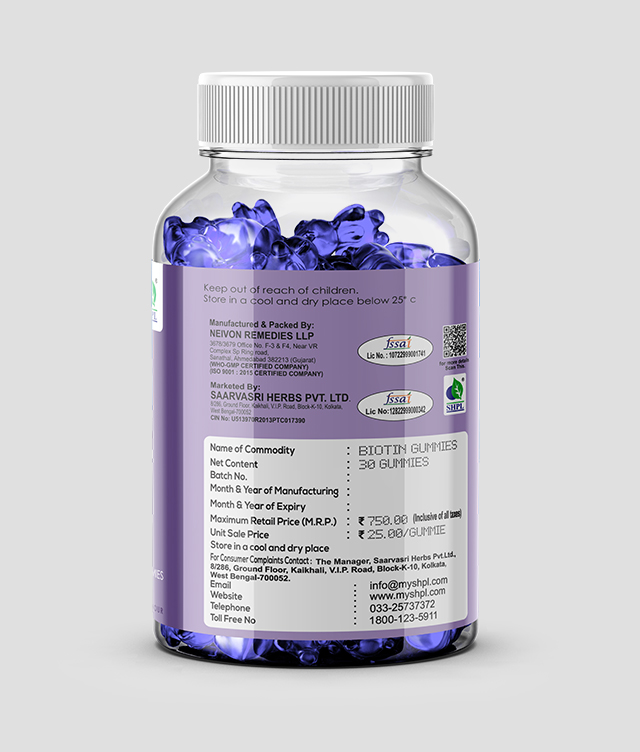 Introducing SHPL Biotin Gummies, a delicious and convenient way to support your journey towards radiant skin, luscious hair, and resilient nails. Packed with the essential B complex vitamin, Biotin, each chewy gummy offers a potent boost to promote collagen production, leading to a brighter complexion and a youthful glow. With regular consumption, our Biotin Gummies help fortify hair follicles, resulting in stronger, shinier locks that exude vitality. Additionally, they work wonders for nail health, fostering resilience and preventing brittleness.