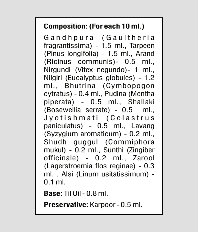 Mahanarayan Tail, Nirggundi Oil, Karpoor, Pudina Tail, Saarsav Tail, Nilgiri Oil, Winter Green Oil, Shallaki, Devdar.
