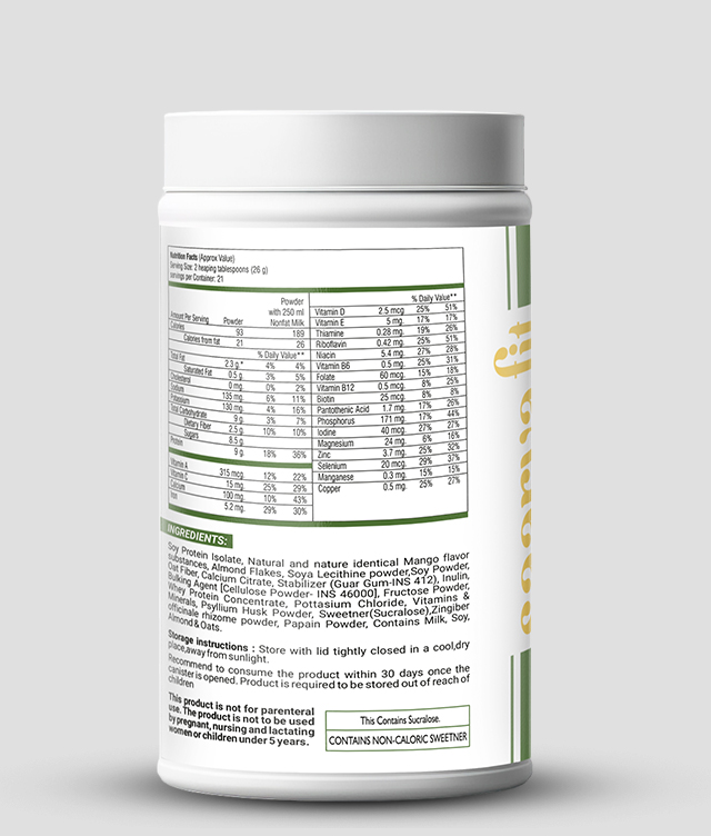 Soy Protein Isolate, Natural & nature identical Mango flavouring, Almond flakes, Soya Lecithine Powder, Soy Powder, Oat Fiber, Calcium Citrate, Fructose Powder, Whey Protein Concentrate, Potassium Chloride, Vitamins, Minerals, Zingiber Officinale Rhizome Powder, Papain Powder