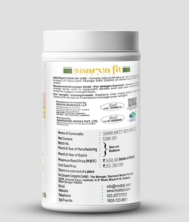 Saarvasri Herbs Saarva-fit Shake is a perfect solution for managing excessive body weight. It works as a meal replacement to reduce your calorie intake and helps you manage weight. It improves your digestion and reduces the accumulation of fats in the body.